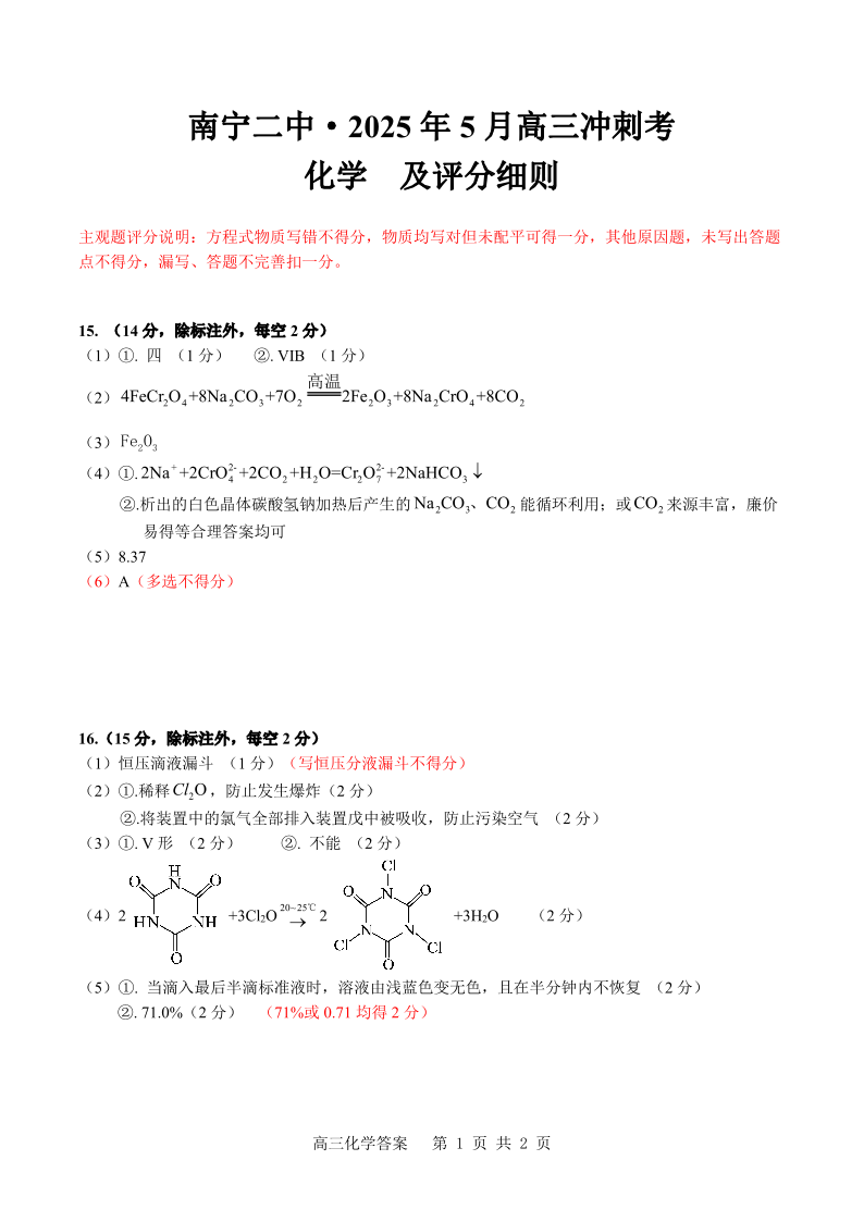 南宁二中2025年5月高三冲刺考 化学评分细则.pdf