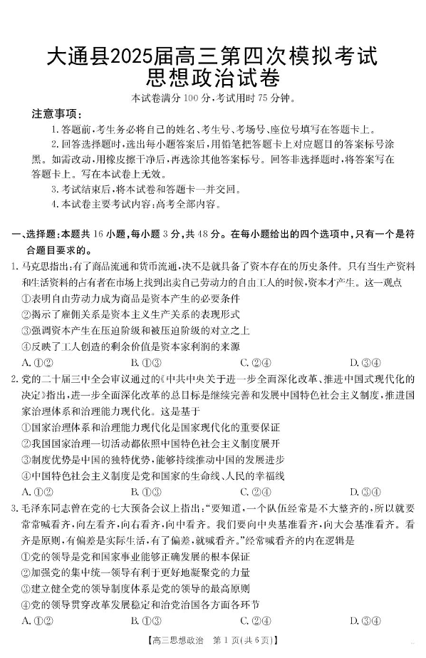 青海省西宁市大通县2025届高三下学期第四次模拟考试政治试卷(含解析).pdf