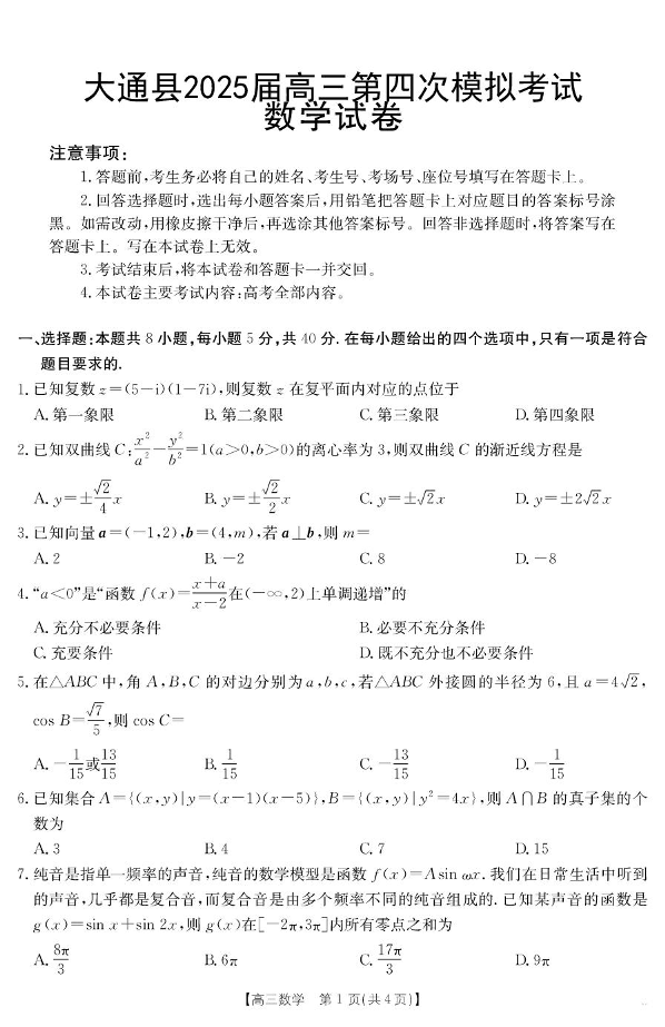青海省西宁市大通县2025届高三下学期第四次模拟考试数学试卷(含解析).pdf