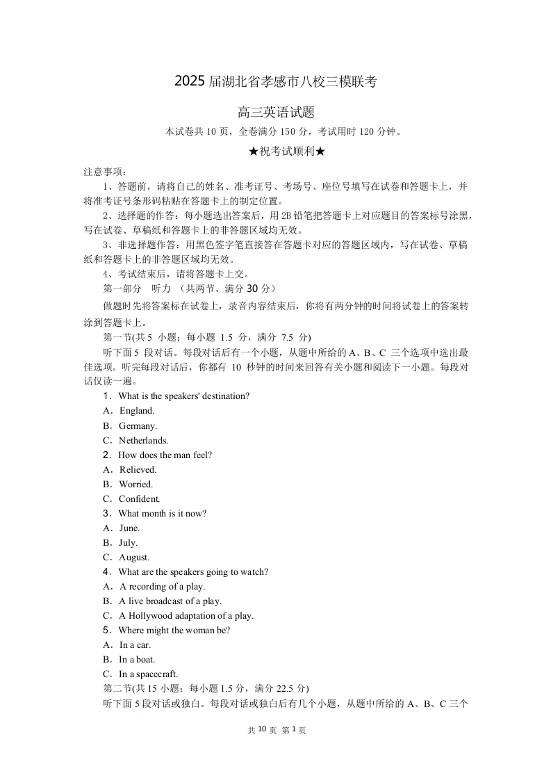 湖北省孝感市八校2025届高三下学期三模联考 英语.docx