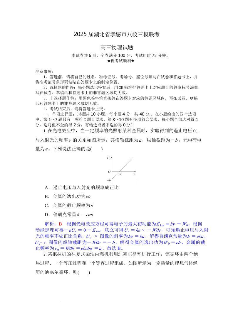 湖北省孝感市八校2025届高三下学期三模联考 物理试题解析板.docx