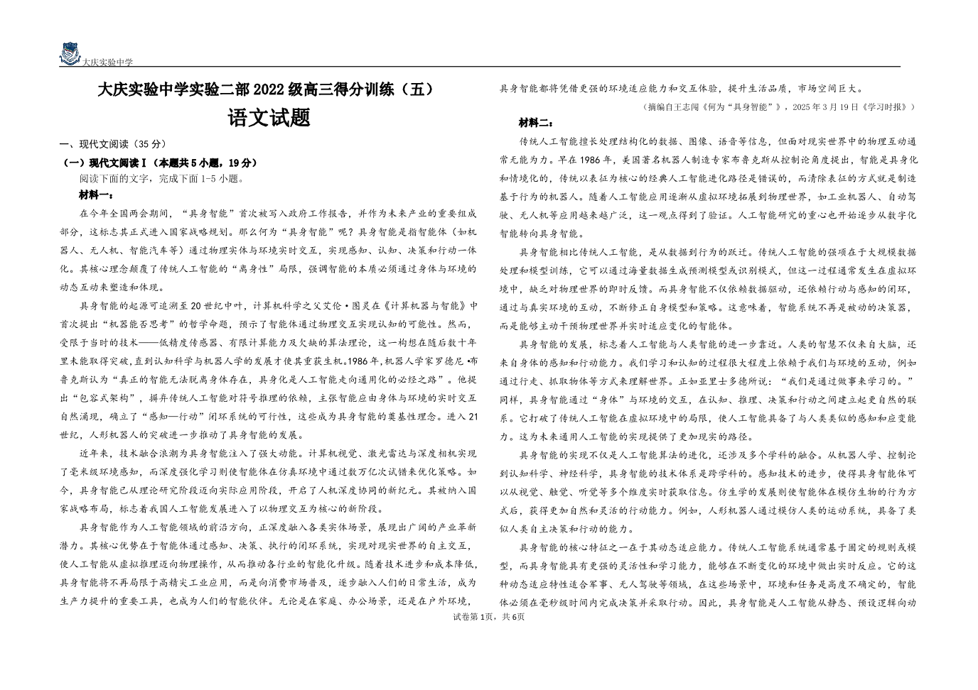 黑龙江省大庆实验中学二部2025届高三得分训练(五)语文.pdf