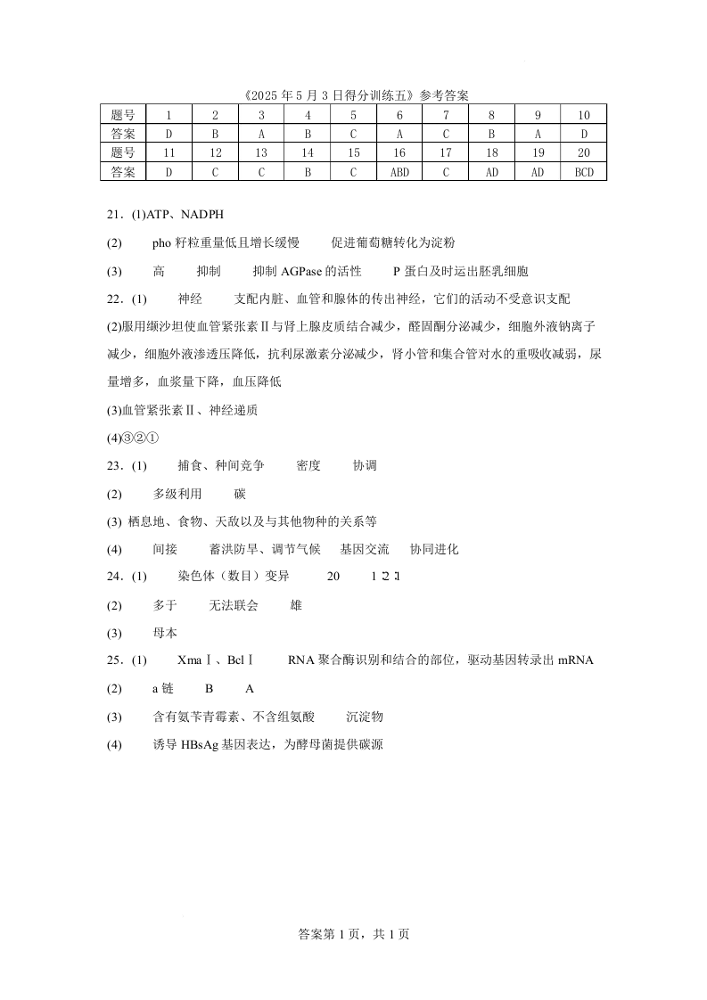 黑龙江省大庆实验中学二部2025届高三得分训练(五)生物答案.docx