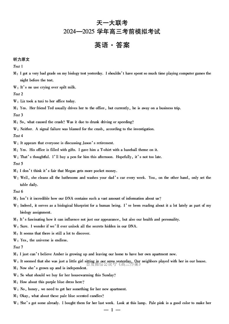 天一大联考2024-2025学年高三考前模拟考试 英语答案.pdf