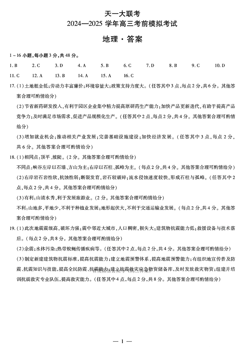 天一大联考2024-2025学年高三考前模拟考试 地理答案.pdf