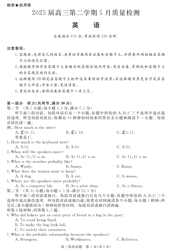 华师联盟2025届高三第二学期5月质量检测 英语.pdf