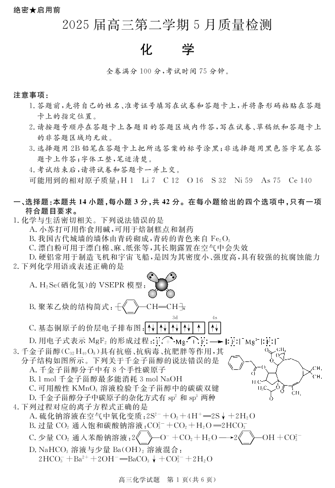 华师联盟2025届高三第二学期5月质量检测 化学.pdf