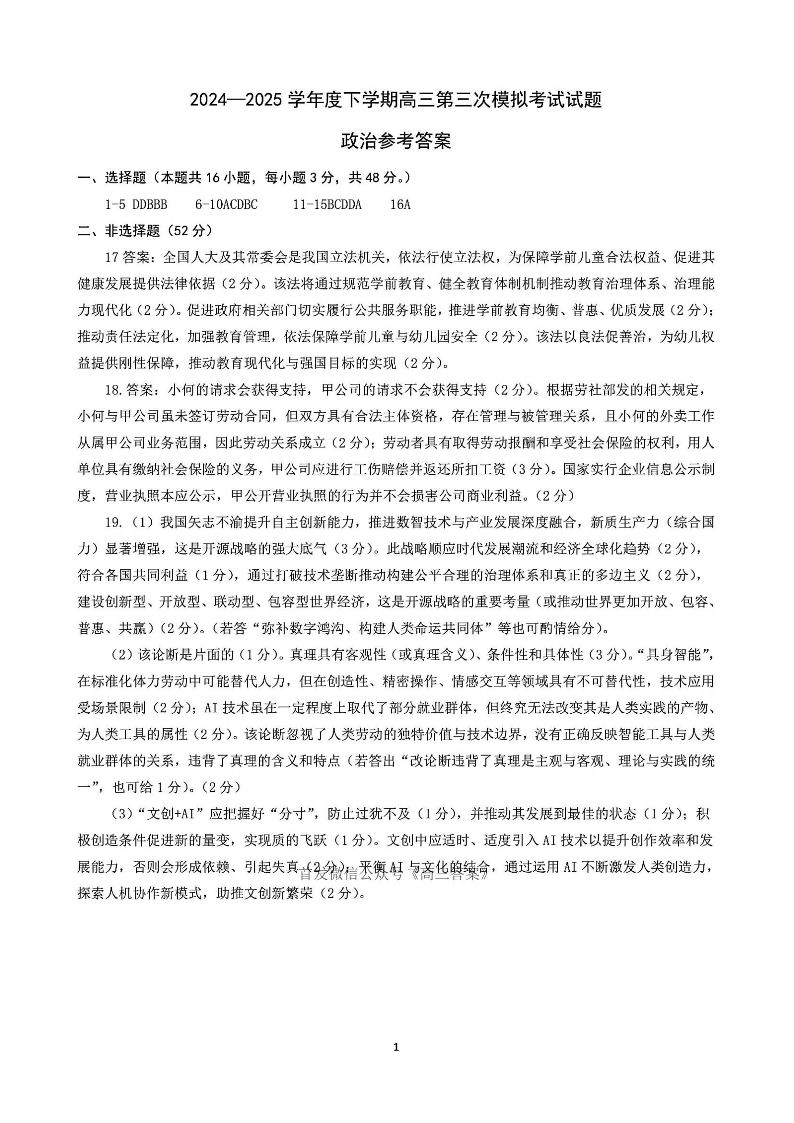 辽宁省协作校2024-2025学年度下学期高三第三次模拟考试 政治答案.pdf