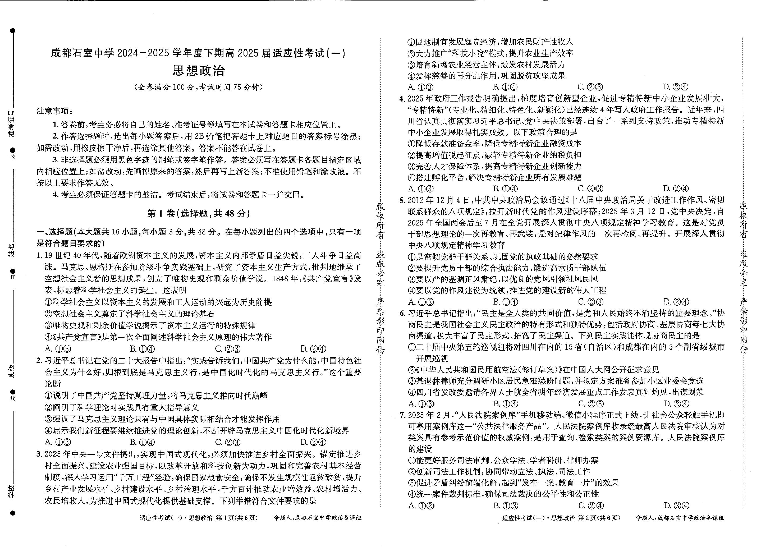 成都石室中学2024-2025学年度下期高2025届适应性考试(一) 政治.pdf