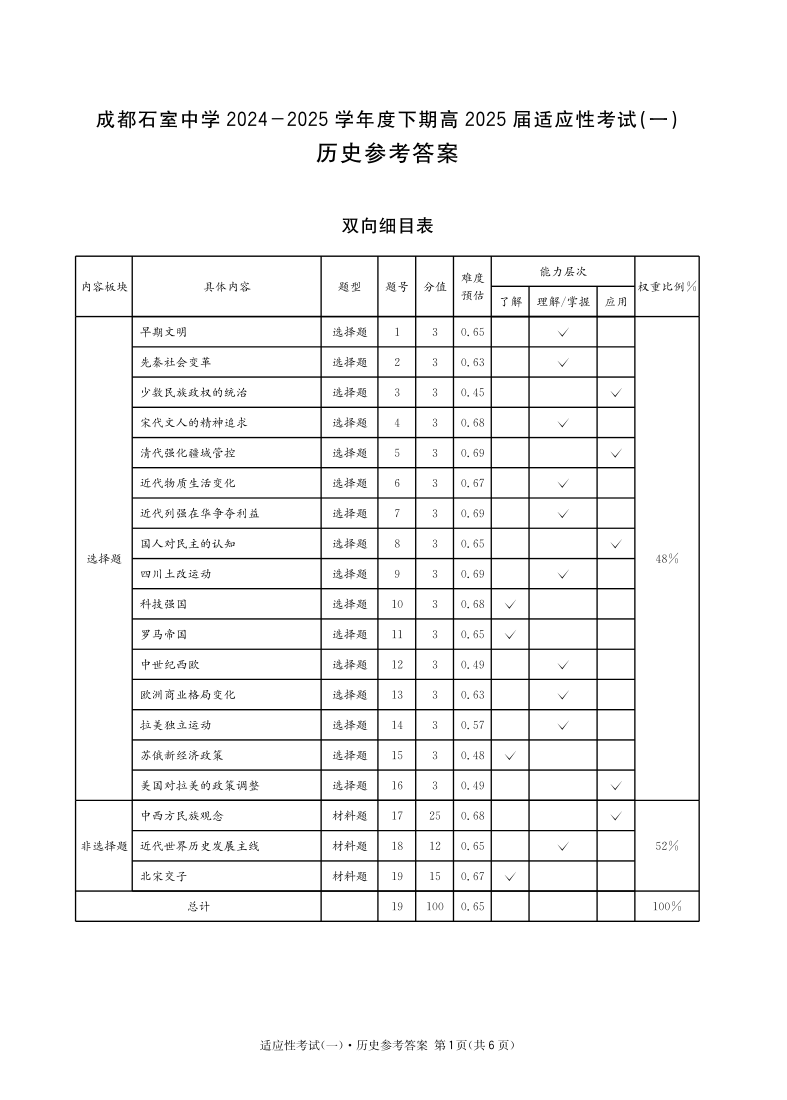 成都石室中学2024-2025学年度下期高2025届适应性考试(一) 历史答案.pdf