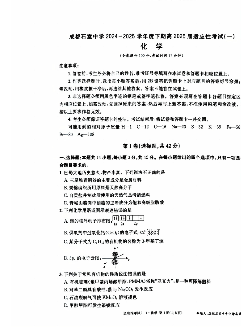 成都石室中学2024-2025学年度下期高2025届适应性考试(一) 化学.pdf