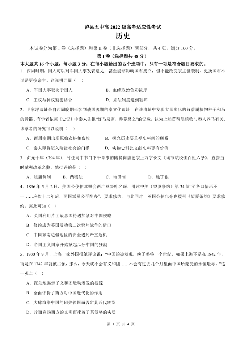 泸县五中高2022级高考适应性考试 历史.docx