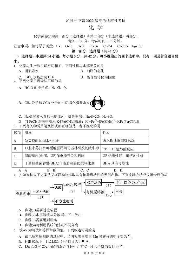 泸县五中高2022级高考适应性考试 化学.docx