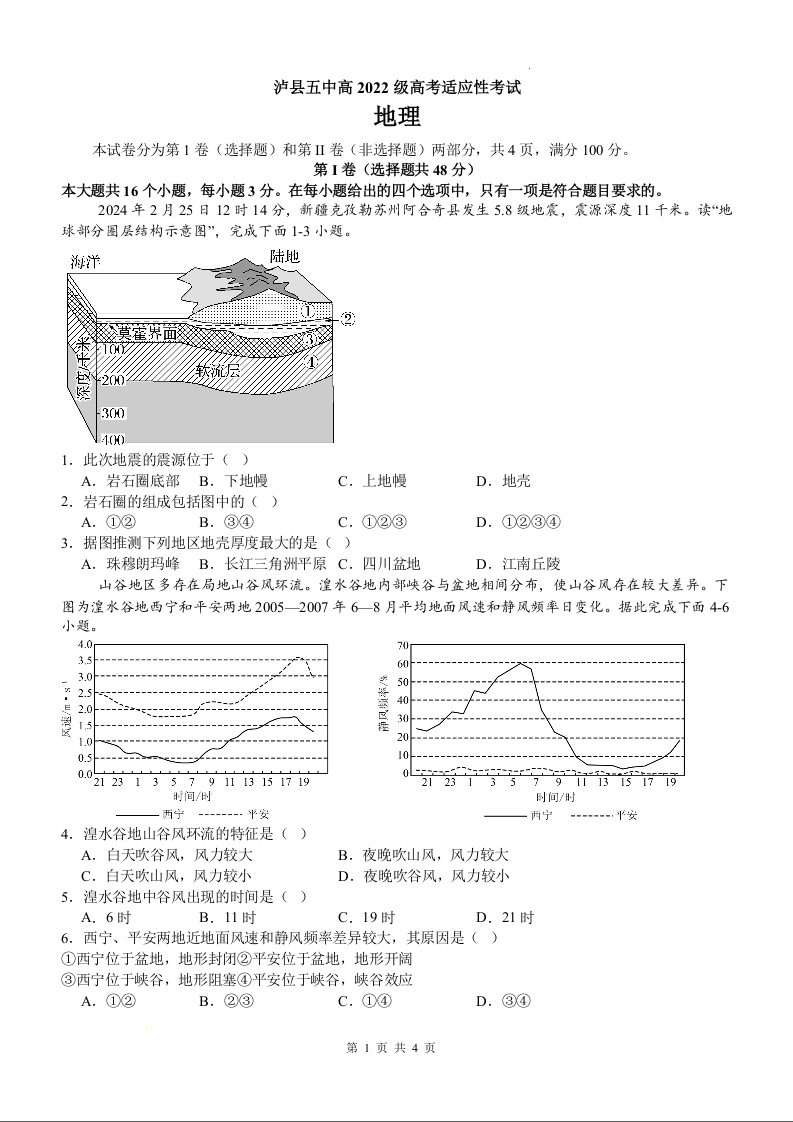 泸县五中高2022级高考适应性考试 地理.docx