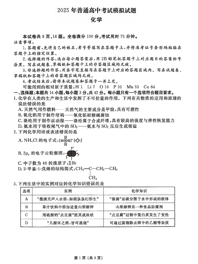 衡水金卷·先享题·信息卷2025届高三模拟试题(五)化学.pdf