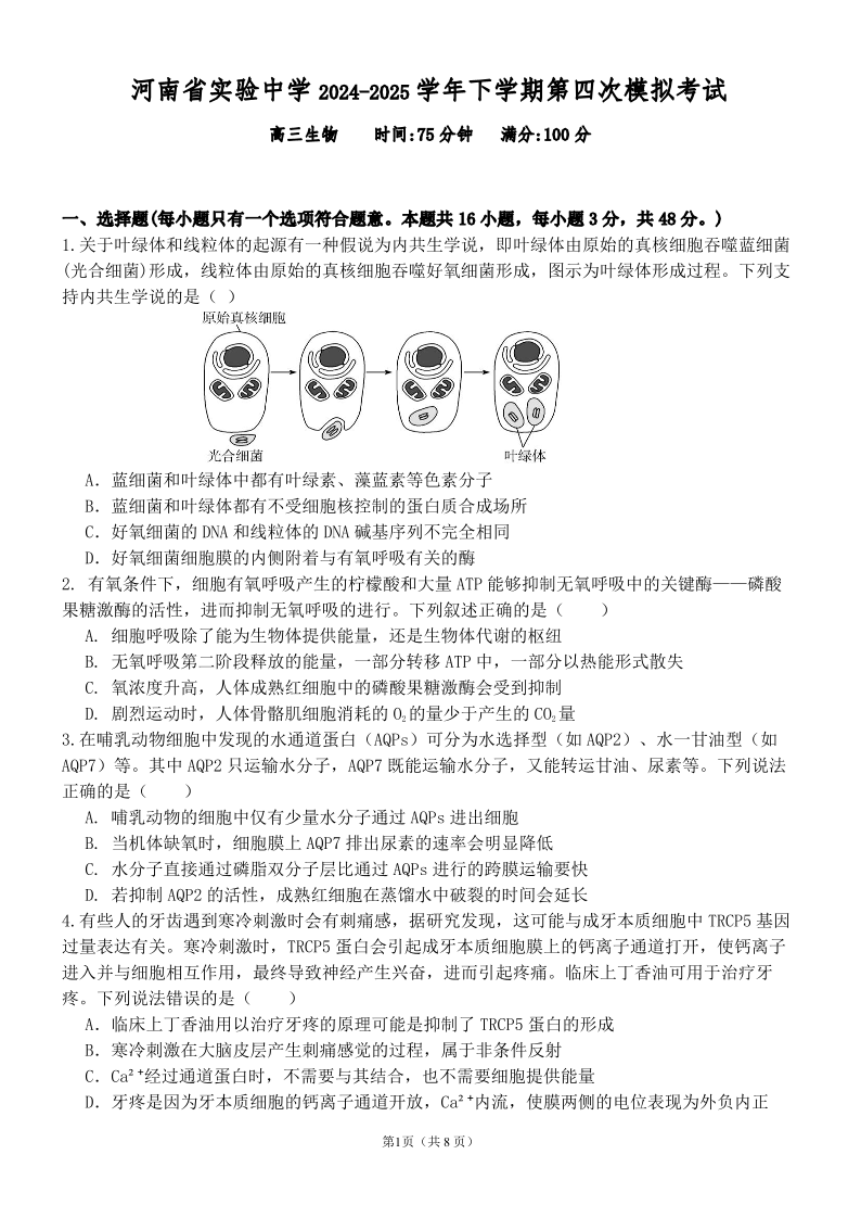 河南省实验中学2024-2025学年高三下学期第四次模拟考试 生物.pdf