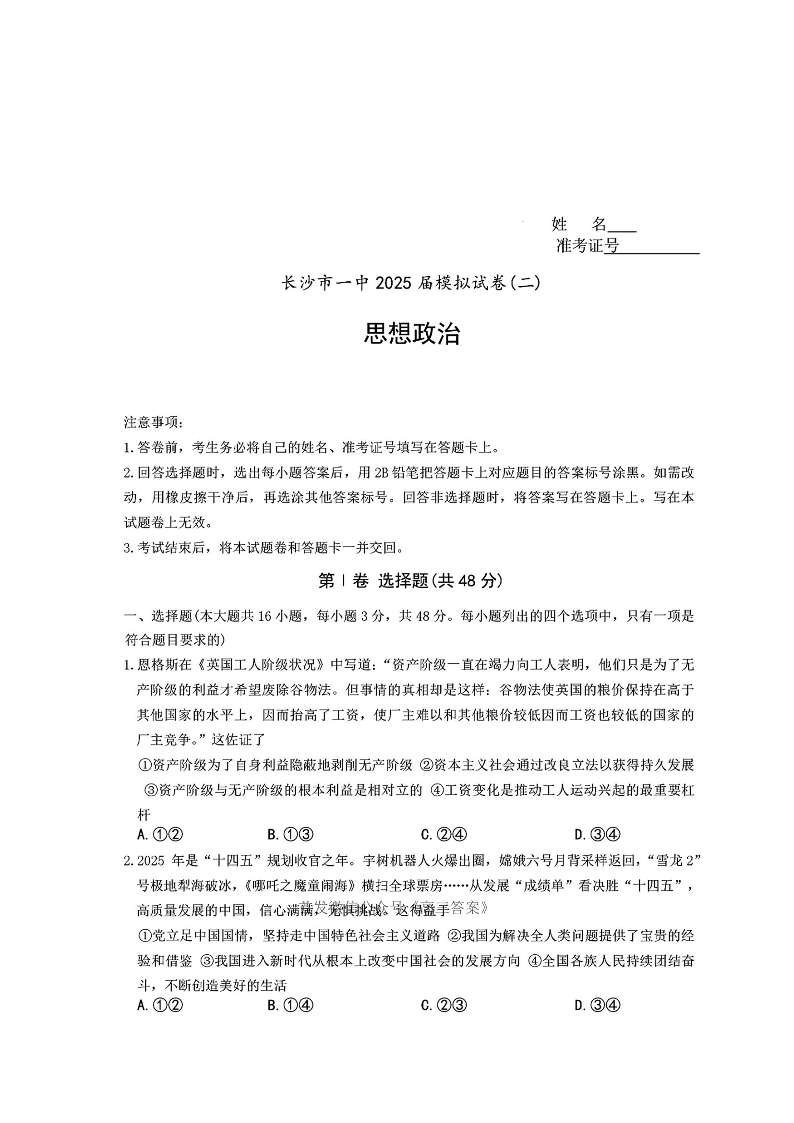 长沙市一中2025届模拟试卷(二)政治(含答案).pdf
