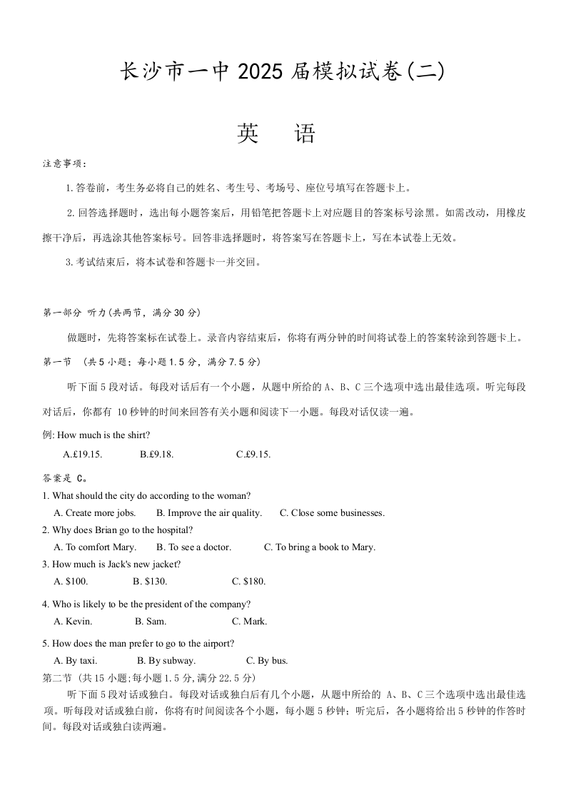 长沙市一中2025届模拟试卷(二)英语(含答案).docx