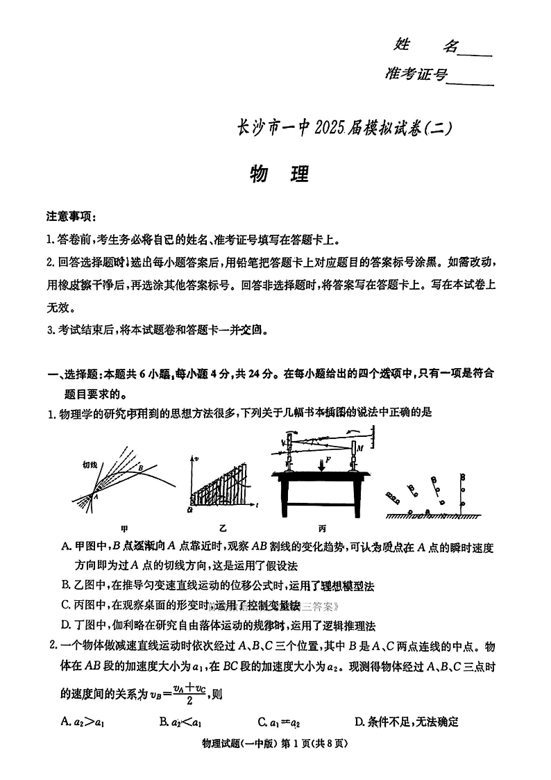长沙市一中2025届模拟试卷(二)物理(含答案).pdf