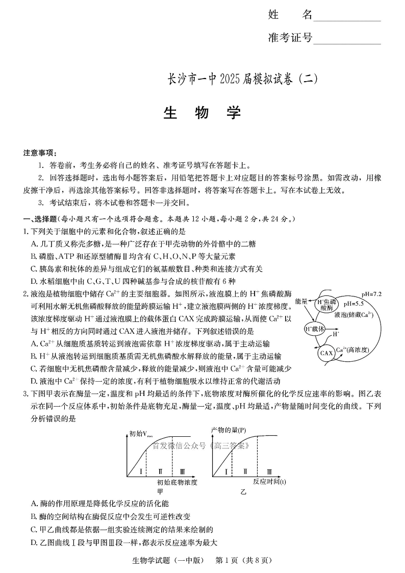 长沙市一中2025届模拟试卷(二)生物(含答案).pdf