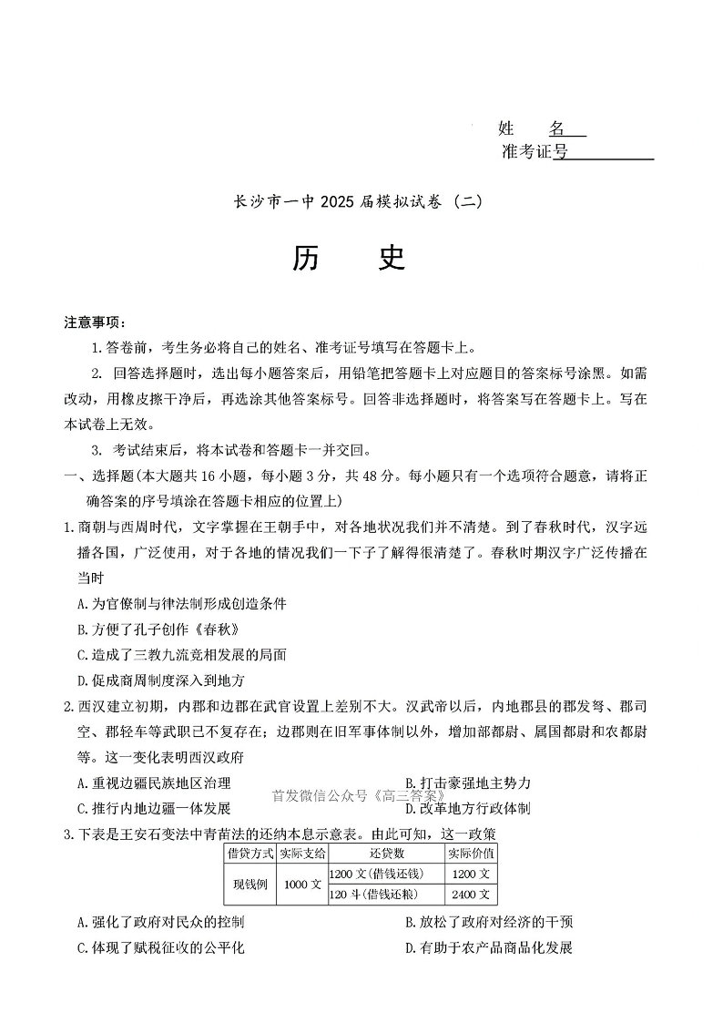 长沙市一中2025届模拟试卷(二)历史(含答案).pdf