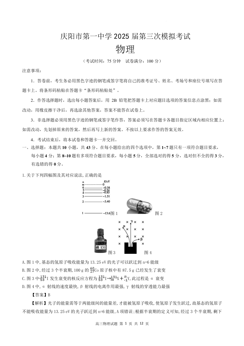 庆阳市第一中学2025届高三三模 物理答案.docx
