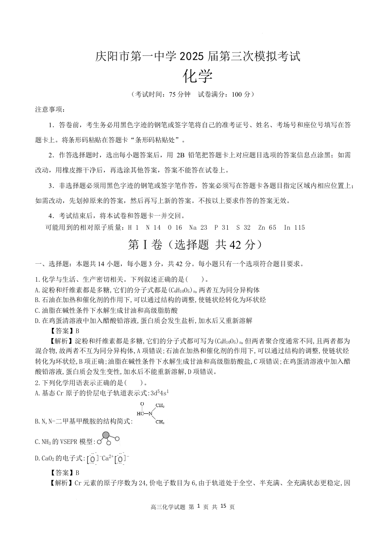 庆阳市第一中学2025届高三三模 化学答案.docx