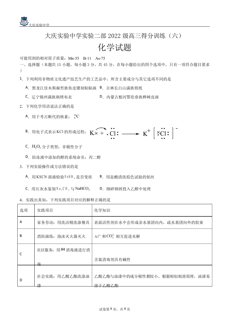 黑龙江省大庆实验中学2025届高三下学期得分训练(六)化学.docx