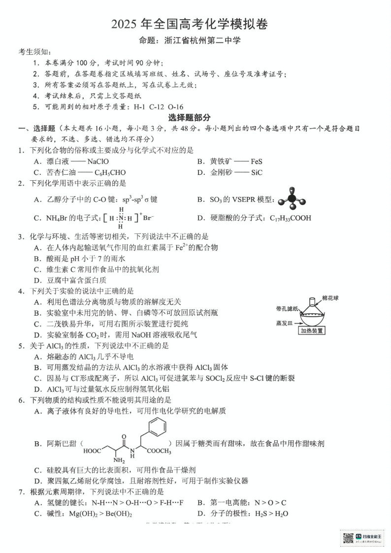 浙江省六校联盟2025届高三5月模拟预测卷 化学试题(含答案).pdf