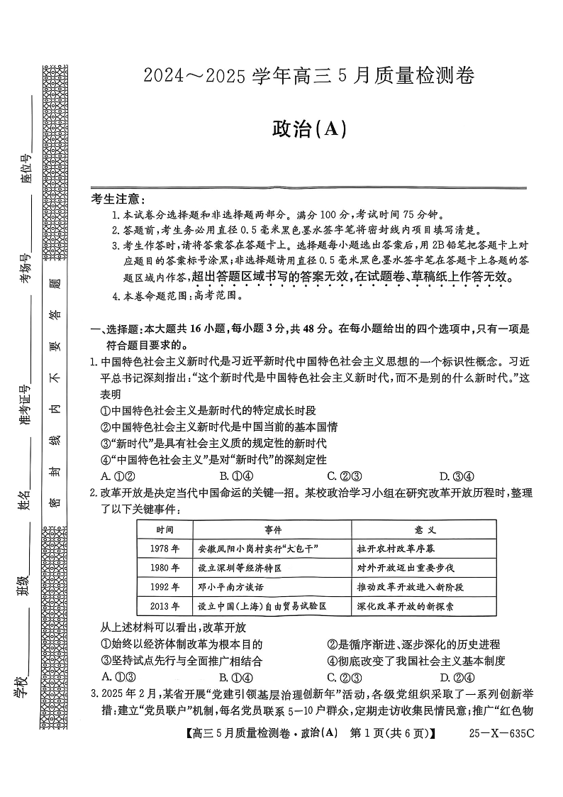 三晋卓越联盟2025届高三5月质量检测卷 政治.pdf