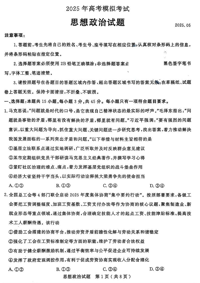山东省济宁市2025年高考模拟考试 政治.pdf