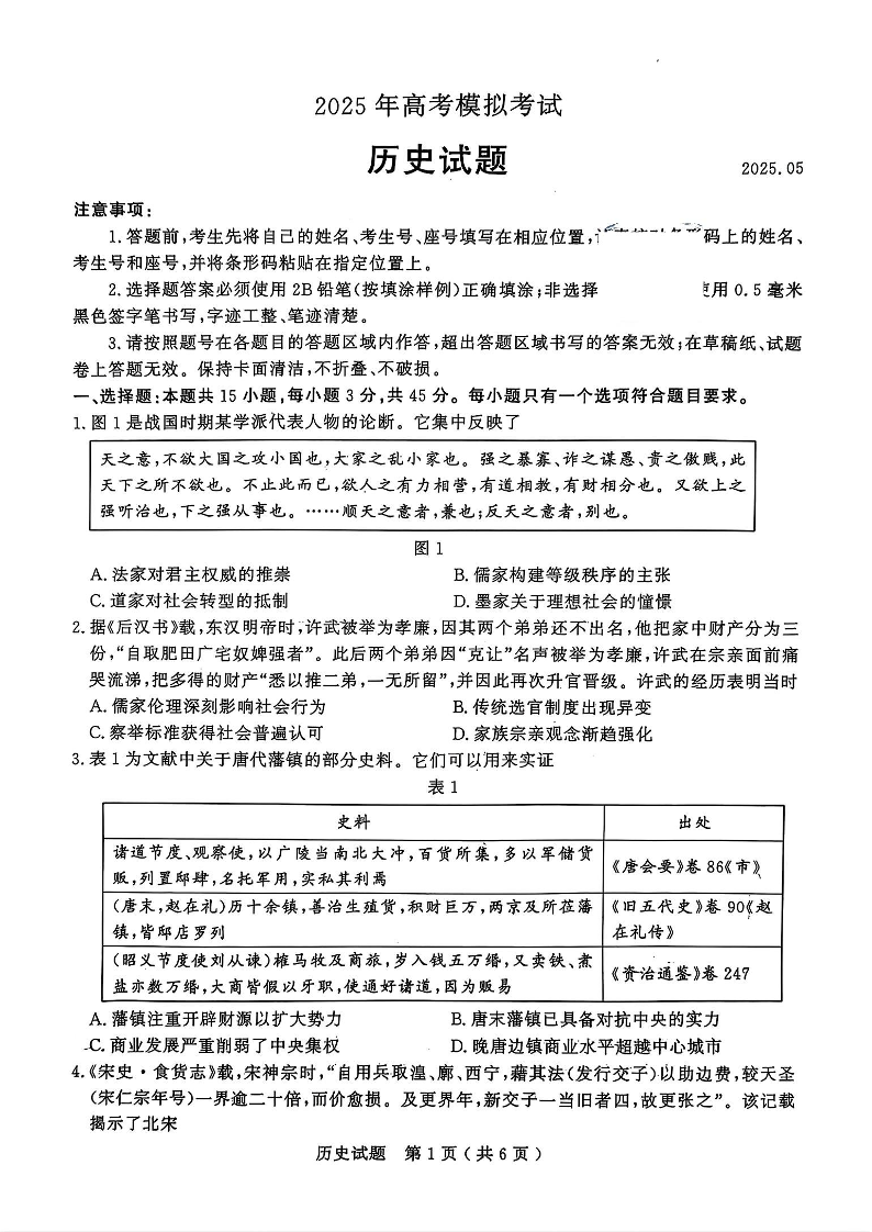 山东省济宁市2025年高考模拟考试 历史.pdf