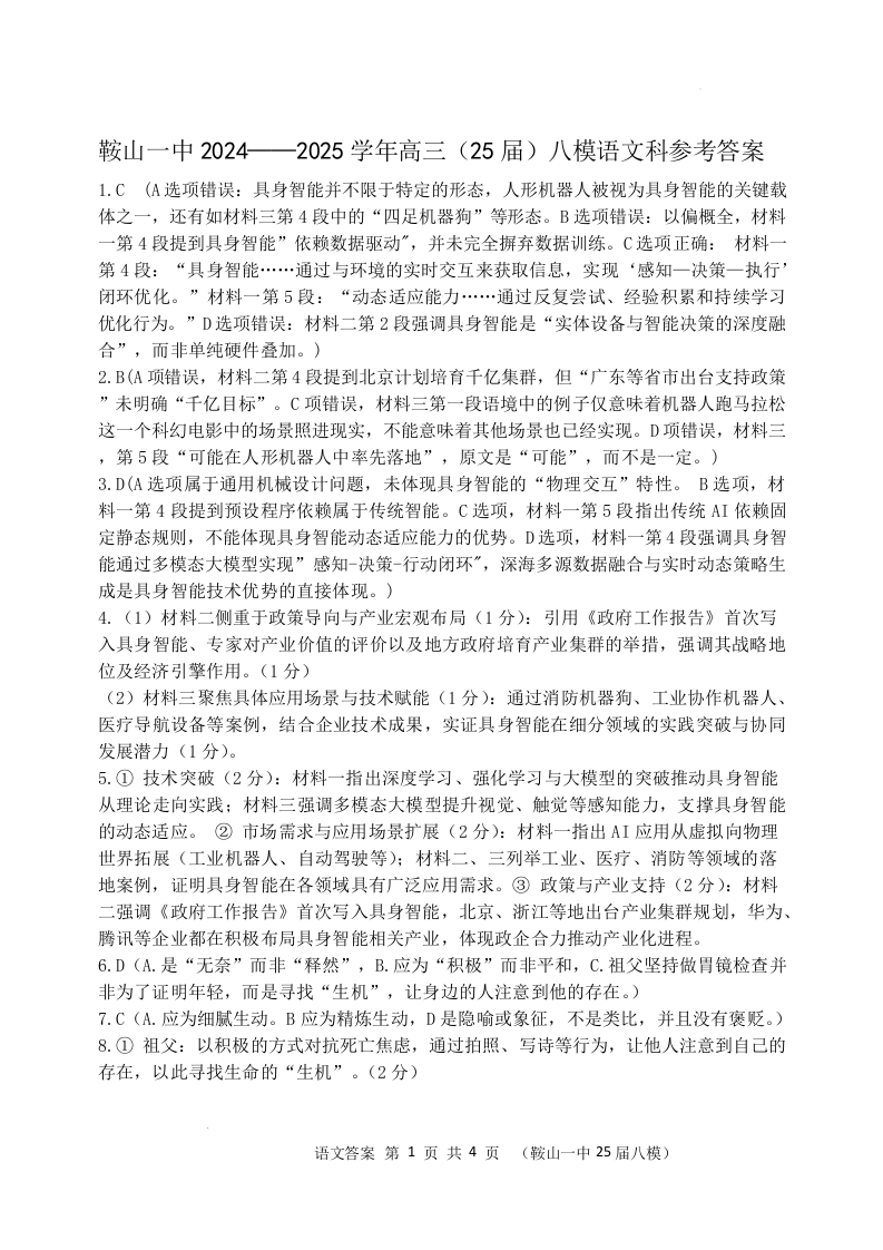 辽宁省鞍山市第一中学2025届高三下学期八模考试 语文答案.docx