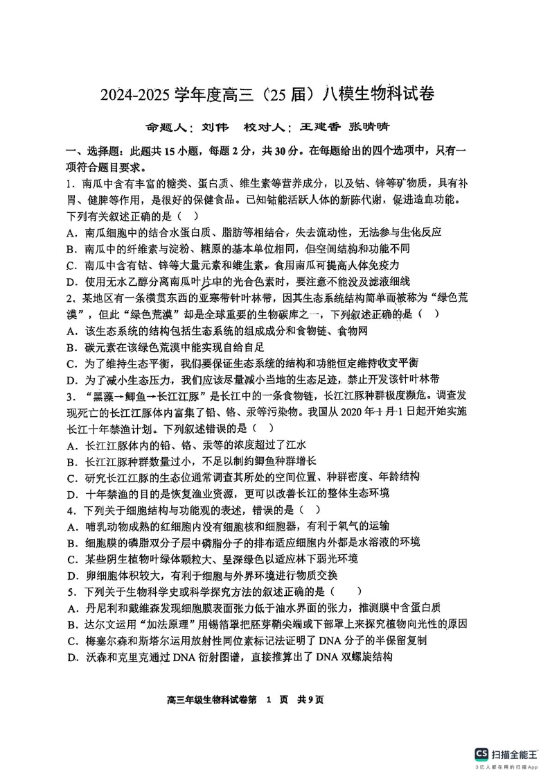 辽宁省鞍山市第一中学2025届高三下学期八模考试 生物.pdf