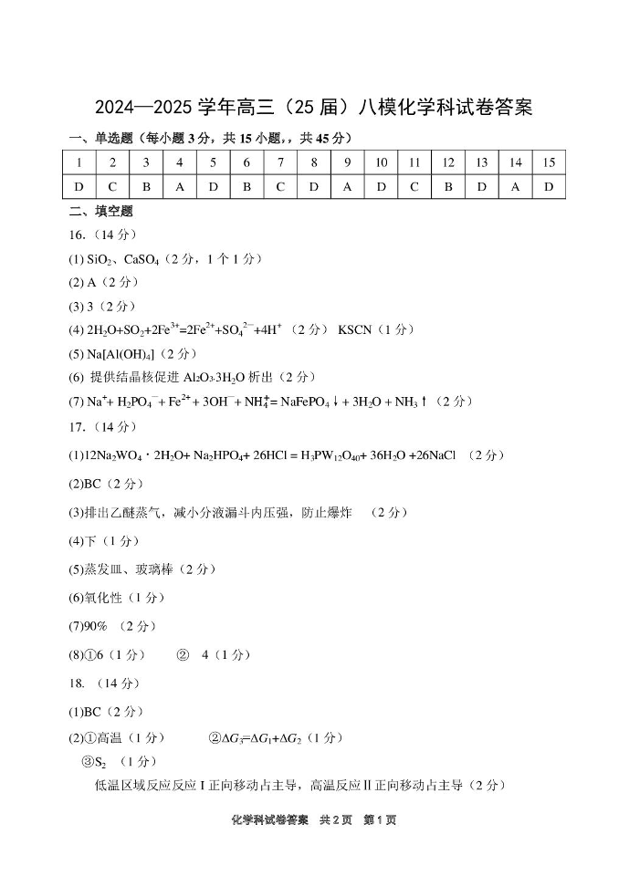 辽宁省鞍山市第一中学2025届高三下学期八模考试 化学答案.pdf