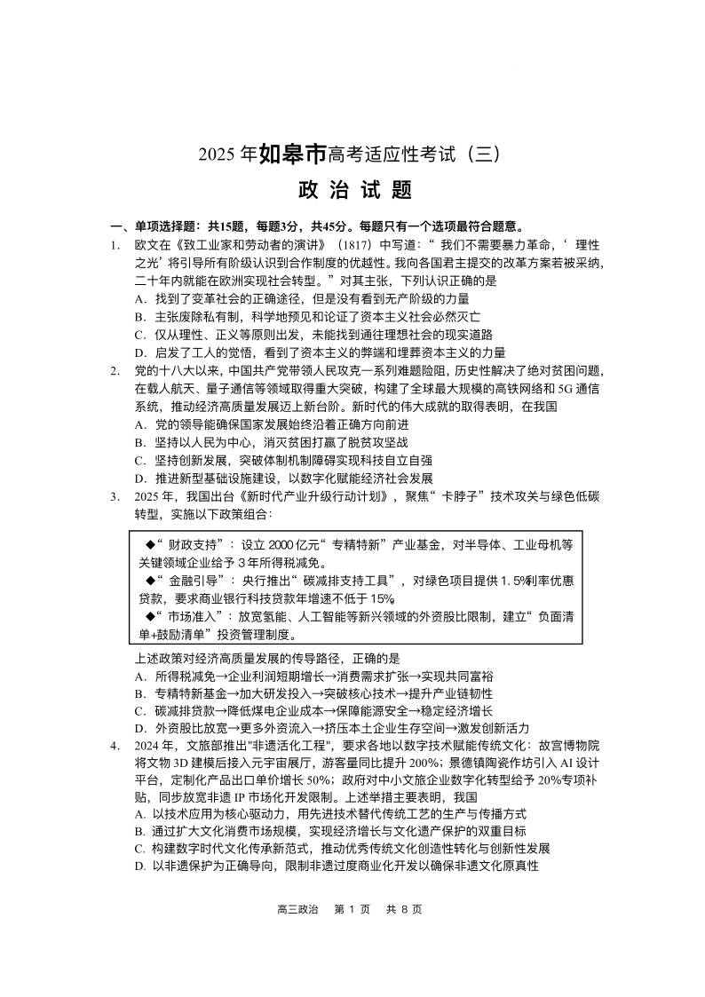 2025届江苏省如皋市高考适应性考试(三)政治(含答案).pdf