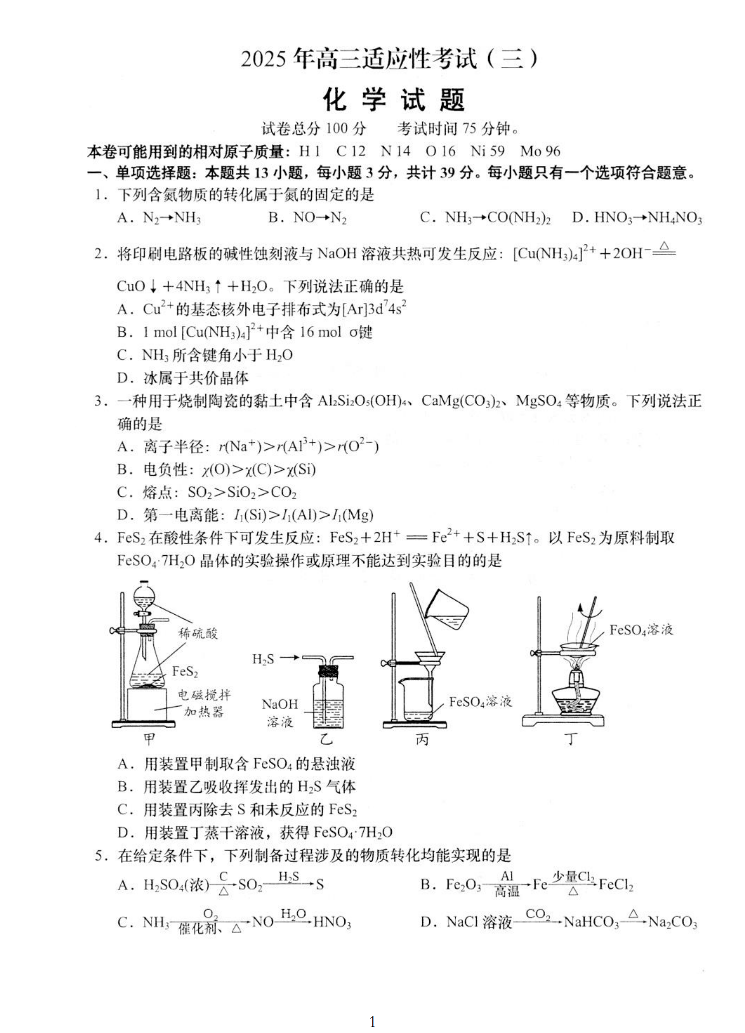 2025届江苏省如皋市高考适应性考试(三)化学(含答案).pdf