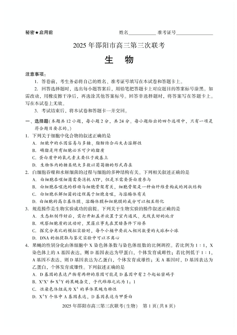 2025年湖南省邵阳市高三第三次联考 生物试题(含答案).pdf