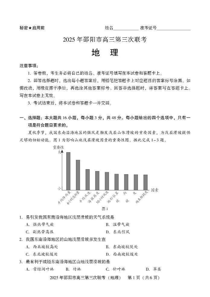 2025年湖南省邵阳市高三第三次联考 地理试题(含答案).pdf