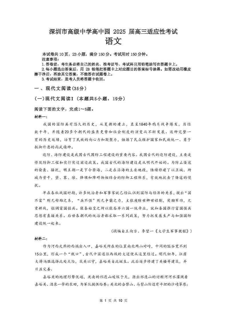 深圳市高级中学高中园2025届高三高考适应性考试 语文试题(含答案).pdf