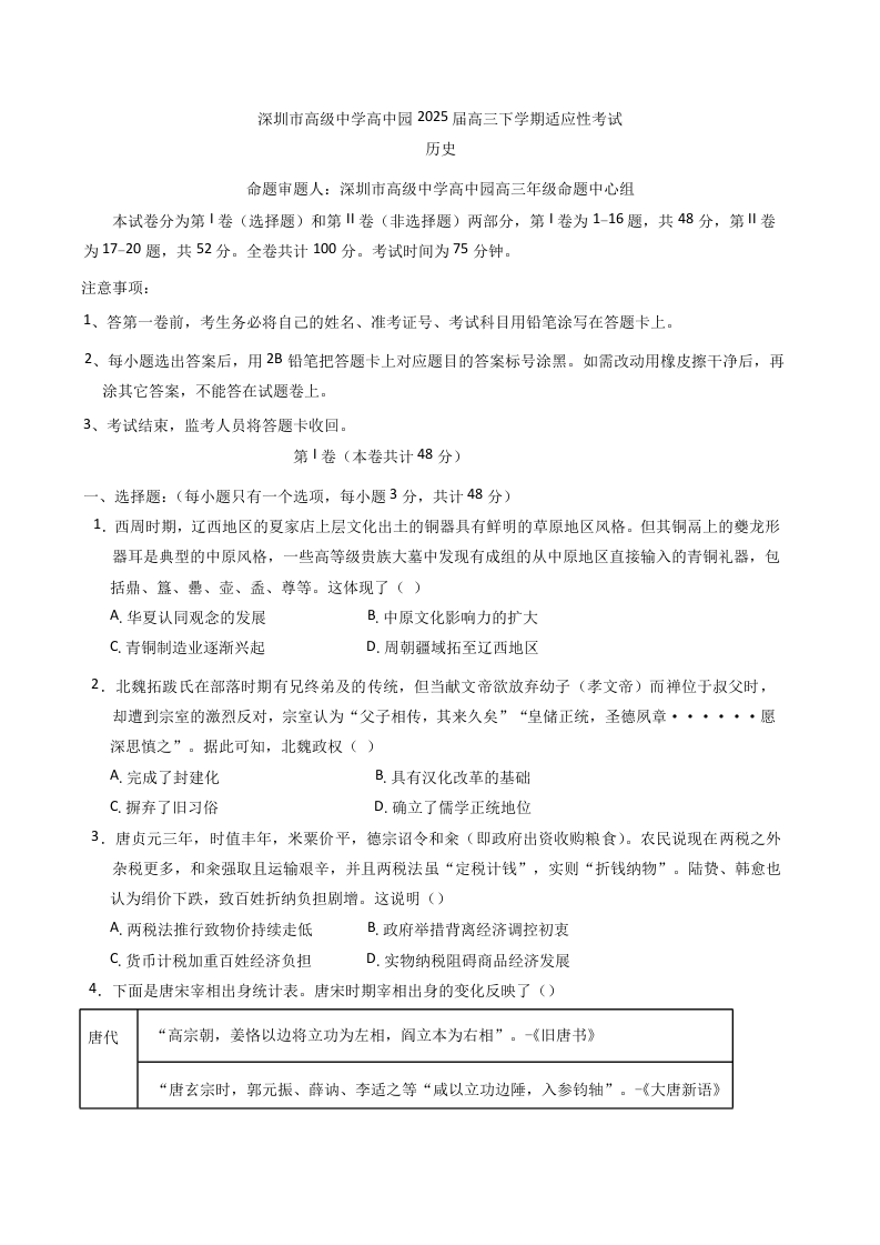 深圳市高级中学高中园2025届高三高考适应性考试 历史试题(含答案).docx