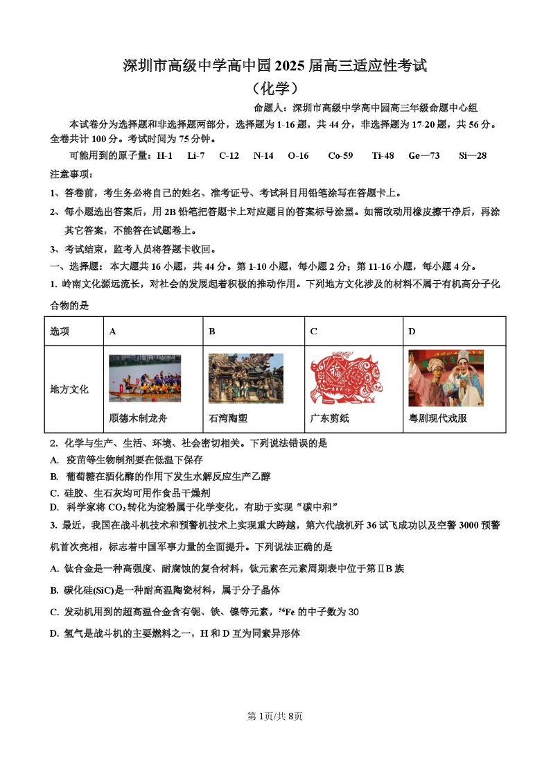 深圳市高级中学高中园2025届高三高考适应性考试 化学试题(含答案).pdf