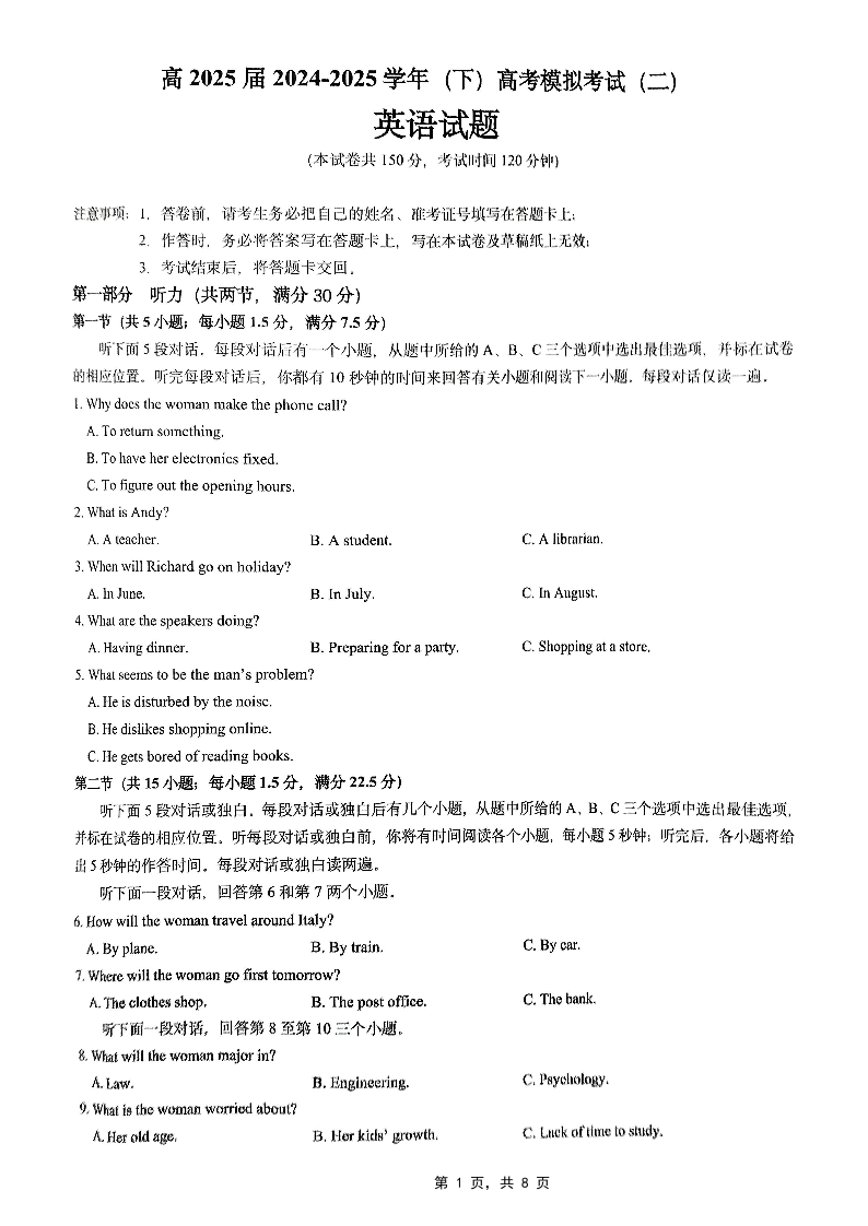 重庆市育才中学2025届高考模拟试题(二)英语.pdf