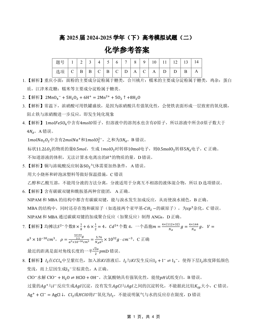 重庆市育才中学2025届高考模拟试题(二)化学答案.pdf