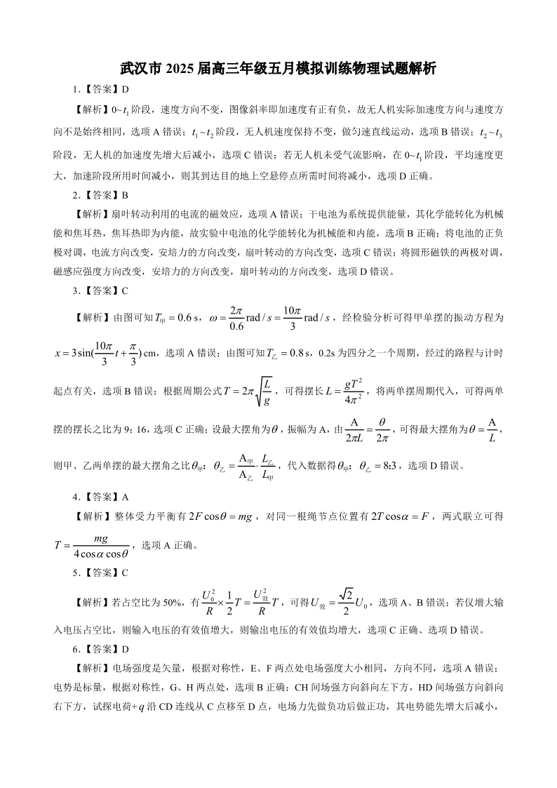 武汉市2025届高三年级五月模拟训练试题 物理答案.pdf