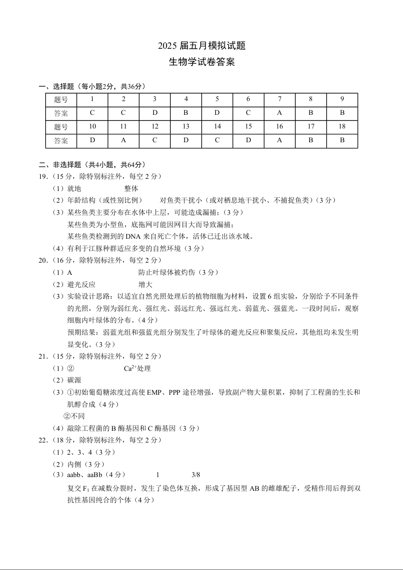 武汉市2025届高三年级五月模拟训练试题 生物答案.docx