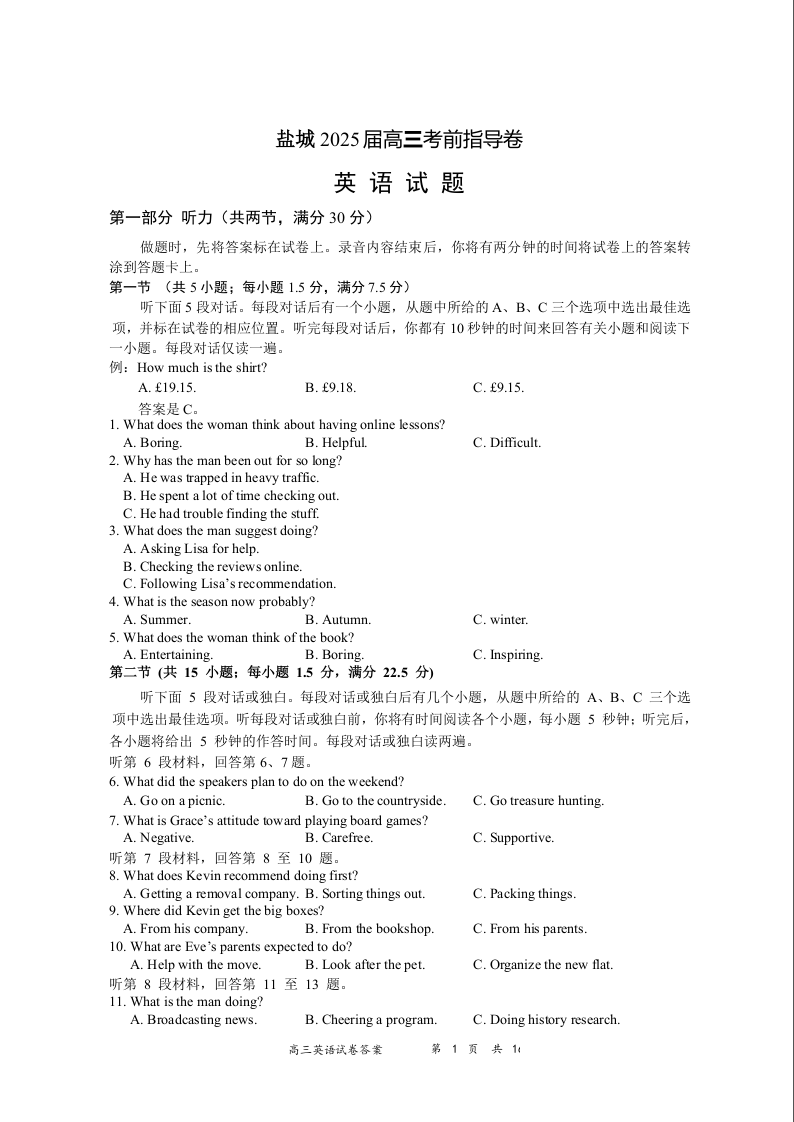 江苏省盐城市2025届高三考前指导卷 英语试题(含答案).docx