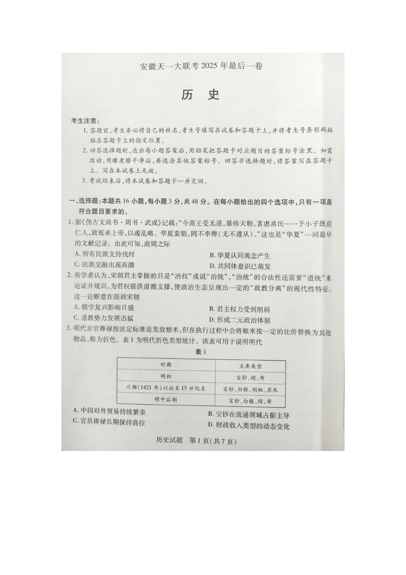 安徽天一大联考2025年最后一卷 历史.docx