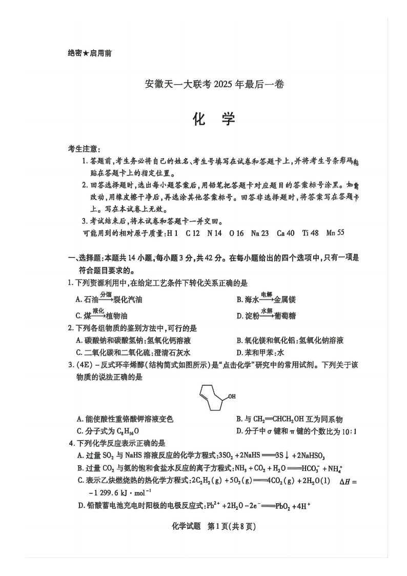 安徽天一大联考2025年最后一卷 化学.pdf