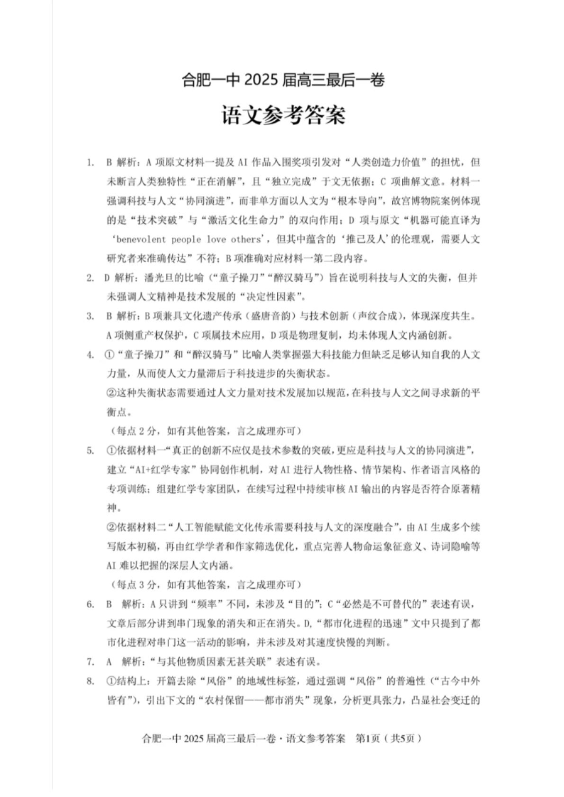 安徽省合肥一中2025届高三最后一卷 语文参考答案.pdf